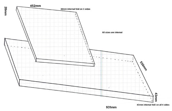 931 x 530 x 43 sides internal . square bends and closed on all 4 corners .The leaf cover will be 452 x 310 x 20 mm sides internal closed on 2 corners note 3 sides only