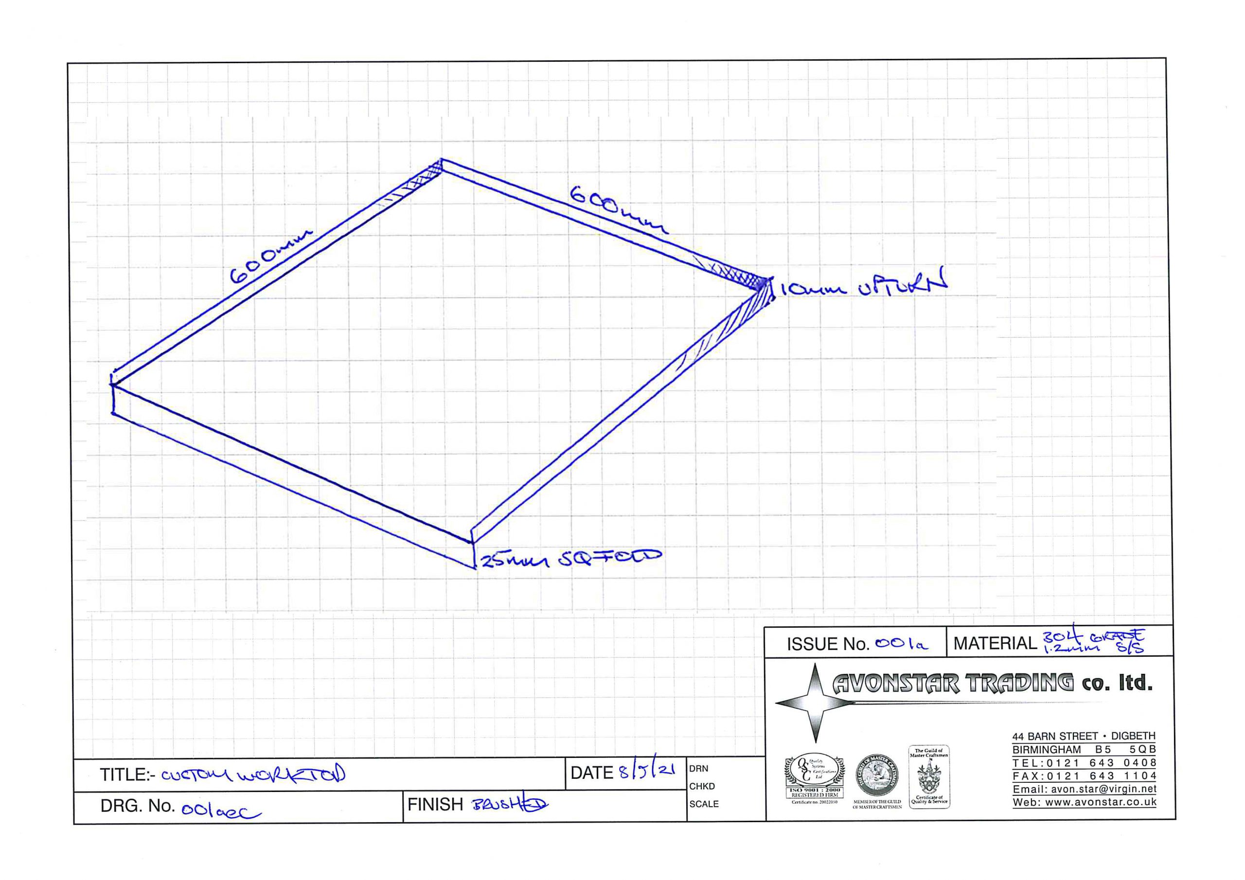 Custom Worktop Saver 600 x 600mm with 25mm Square Fold and 3 x 10mm upturn