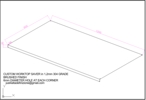 stainless steal worktop 600×1200 with a squared edge to be screwed over a wooden worktop. The worktop needs to have a lip over the long edge to cover the front of the table, please. Can you please provide a quote for such piece and can you provide it with holes on all corners to help screwing the worktop in place?